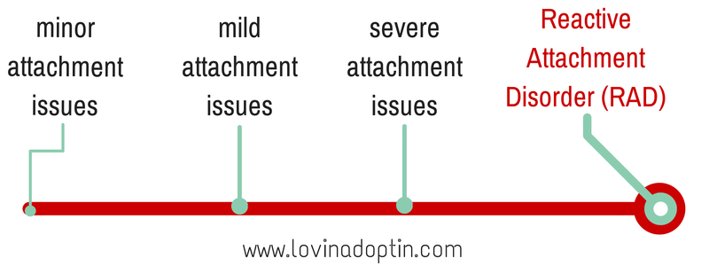 To help our children with attachment issues, we need to first understand the basics of what it is, and why our children are not forming a bond with us. The website childtrauma.org says, “The attachment bond has several key elements: 1) an attachment bond is an enduring emotional relationship with a specific person; 2) the relationship brings safety, comfort, soothing, and pleasure; 3) loss or threat of loss of the person evokes intense distress.” I believe that attachment issues are on a spectrum. Here’s a graph that explains: