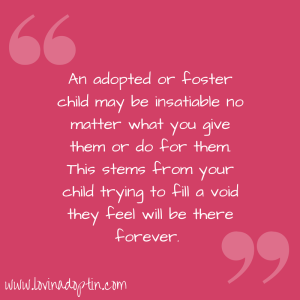 With foster and adopted children, they may have had a life of poverty or neglect before they came to you. Their insatiable need stems from not having anything, and wanting to fill a void that they feel will be there forever. But this desire for more can last much longer than we might anticipate. Well, all behaviors in hurting kids last longer than the parent anticipates, you can read more about that here.