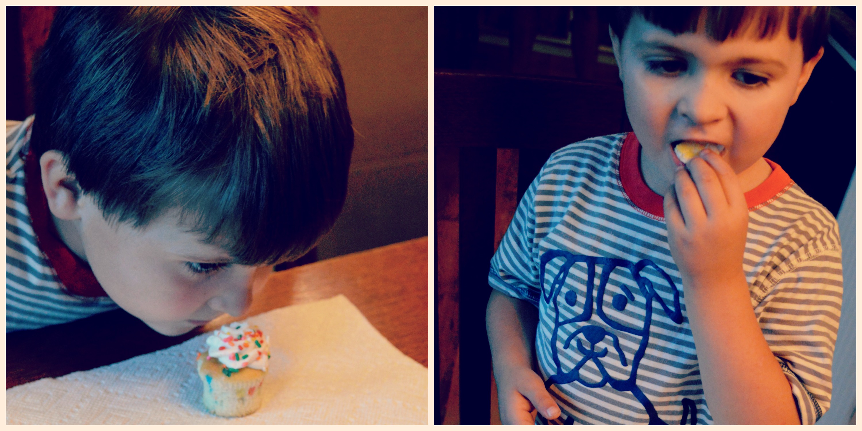 Jeremiah turned five today. So, here’s the birthday deal. Jeremiah doesn’t like many foods (like, um, two at the moment) and doesn’t like cake, but this year I wanted cake. (I apologize to my sweet boy for the piddly cupcake, it’s your Dads fault.)