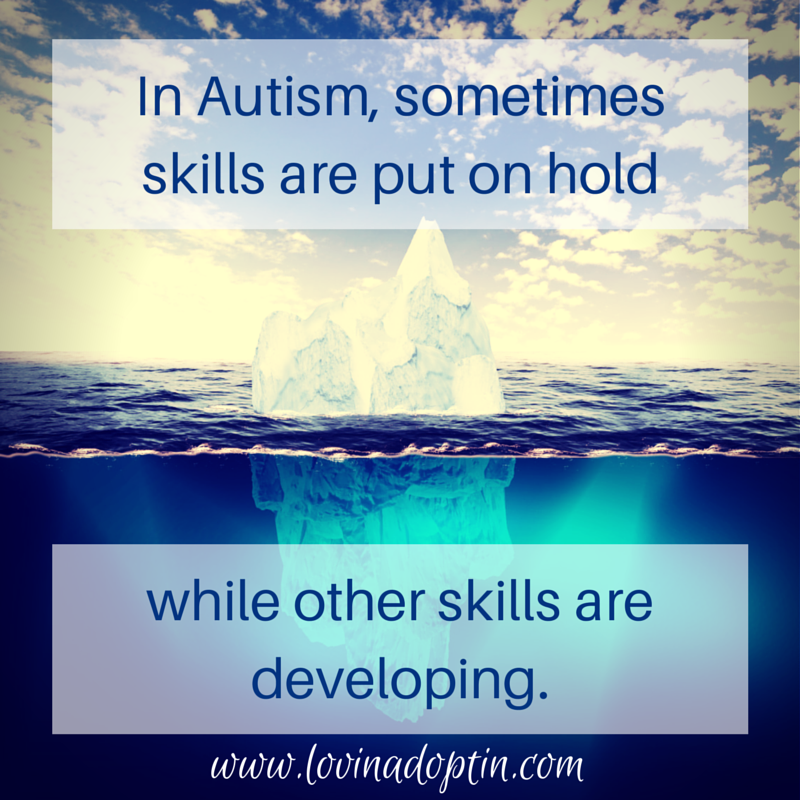 So, just to encourage you parents, if you see your child isn’t doing something, or skills come and go, remember that sometimes those “skills” might just be placed on hold while something else is developing. We really don’t know how the Autistic brain works, but it works differently and they may need that time to put a skill aside while they work on another. For me, it’s really taken some of the frustration away when I can see it like this.